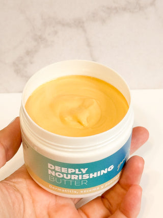 Mantequilla que nutre a profundidad para reparar pieles con síntomas de dermatitis, psoriasis y eczema. También es auxiliar para dar alivio y confortar la piel de otros síntomas como ampulas, llagas, prurito, descamación o ardor.